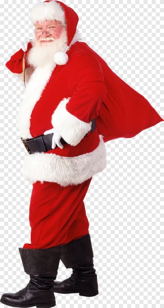 Download this delightful free PNG of Santa Claus, perfect for all your festive projects! This high-quality transparent image features a cheerful Santa walking, looking back with a warm smile. He's dressed in his iconic red suit with white fur trim, wearing glasses, and carrying a large, full red gift sack over his shoulder. Ideal for Christmas cards, holiday promotions, website banners, social media posts, or any seasonal design. Get your transparent Santa for holiday cheer now!