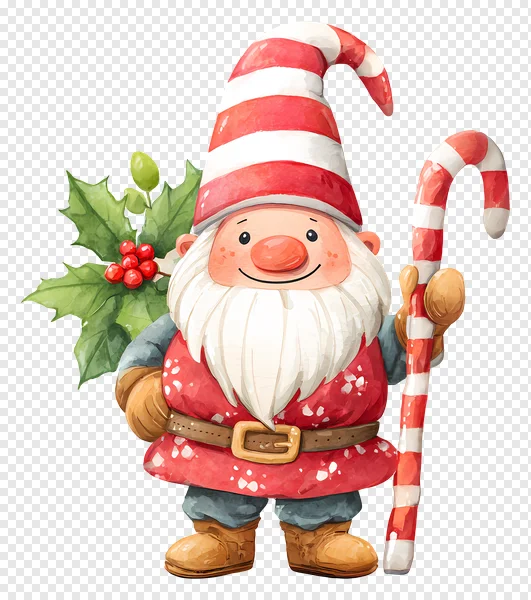 Tags: Christmas decoration Christmas gnome Nisse Santa gnome Tomte candy cane cute gnome digital art festive free download holiday cheer holiday gnome holly berries red hat smiling gnome transparent PNG watercolor illustration whimsical white beard winter
