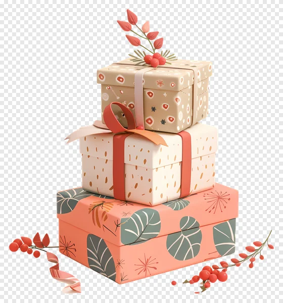 Download this stunning free PNG of three chic stacked gift boxes, perfect for adding a touch of festive elegance to your projects! This high-quality 3D illustration features beautifully wrapped presents in warm tones of coral, beige, and cream, adorned with stylish patterns, delicate ribbons, and decorative berries. Ideal for Christmas, New Year, birthdays, anniversaries, and any special celebration, these modern gifts come with a transparent background. Ready for instant use in your graphic design, web projects, social media posts, invitations, or marketing materials. Enhance your designs with these vibrant, elegant, and modern holiday gifts!