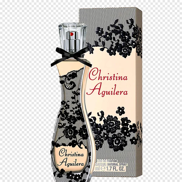 Download a stunning, high-quality PNG of the Christina Aguilera perfume bottle and its elegant box. This Eau de Parfum features a beautiful black lace pattern over a subtle beige/nude background, a chic black ribbon bow, and a crystal-clear cap, embodying celebrity glamour and sophisticated style. Perfect for beauty blogs, cosmetic websites, product mockups, graphic design projects, or fan art. Get this transparent background image for free and add a touch of luxury and femininity to your designs. Ideal for fashion, fragrance, and high-end product themes.