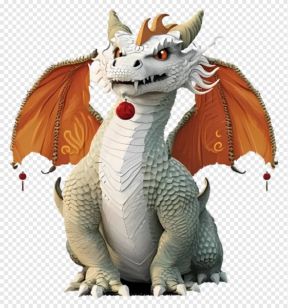 Unleash your creativity with this adorable and majestic white dragon PNG, featuring striking orange wings with delicate oriental patterns, piercing red eyes, and a charming red pendant. This high-quality fantasy creature illustration is perfect for adding a touch of magic to your graphic design projects, digital art, web content, or themed events. With its transparent background, seamless integration is guaranteed. Download this unique, stylized dragon image for free today and bring your fantasy concepts to life!