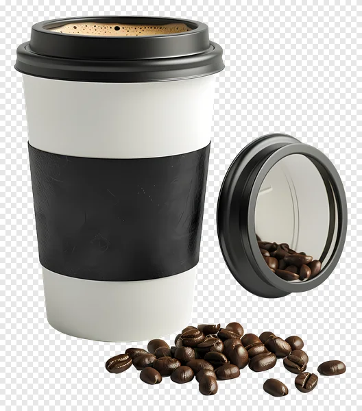 Download this high-quality coffee to-go cup PNG image for free! Featuring a realistic white and black cup with lid, spilling coffee beans, perfect for websites, presentations, graphic design, and more. Enhance your projects with this versatile coffee graphic. Transparent background for easy integration. Get your free download now!