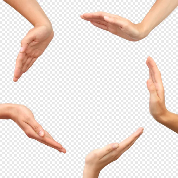 Download this striking free PNG image featuring five diverse human hands arranged in a perfect circle with open palms, creating a central blank space. Ideal for projects needing visuals of teamwork, unity, community, partnership, protection, or support. This high-quality graphic with a transparent background is perfect for presentations, websites, educational materials, or design concepts where 'holding space' or collective effort is key. Enhance your creative work instantly – get this unique collaboration hands PNG for free now!