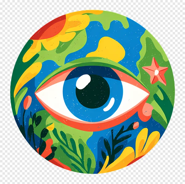 Download this stunning, free PNG of a vibrant, abstract eye set against a colorful backdrop of nature and Earth elements. Featuring bold blues, greens, yellows, and reds, this graphic symbolizes environmental awareness, vision, and the planet's watchful gaze. Perfect for ecological projects, spiritual themes, website design, social media posts, or any creative endeavor needing a unique, high-quality visual. Get your transparent background PNG today and bring a touch of inspired nature to your designs!