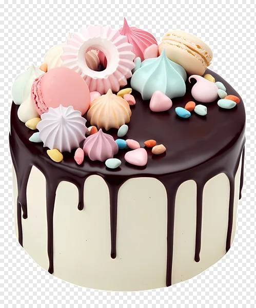 Download this stunning, high-quality PNG image of a delightful drip cake for free! This eye-catching dessert features rich, dark chocolate ganache elegantly dripping over a smooth, creamy white cake. It's beautifully adorned with an assortment of charming pastel-colored meringues, vibrant macarons in shades of pink, cream, and light blue, and cheerful candy sprinkles. Perfect for birthday invitations, bakery menus, digital designs, social media posts, party decor, or any creative project needing a touch of sweetness and celebration. The transparent background ensures seamless integration into your designs. Get your free, delicious-looking cake visual today!
