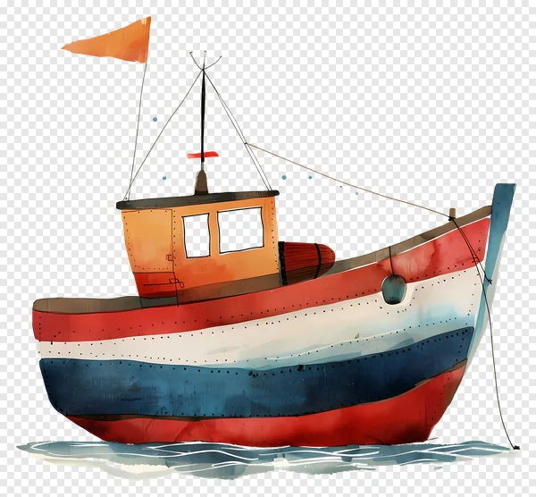 Download this stunning, high-quality PNG image of a vibrant fishing boat! Perfect for nautical designs, illustrations, children's projects, or adding a splash of color to your artwork. This free PNG features a beautifully painted boat with a red, white, and blue hull and an orange cabin, set against a black background. Transparent background for easy integration into your projects. Get your free download now!