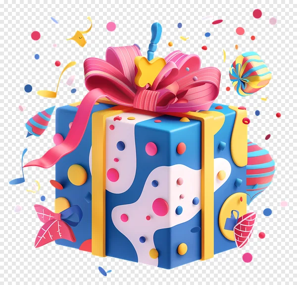 Download this vibrant and playful gift box PNG image for free! Perfect for birthday graphics, holiday designs, party invitations, or adding a festive touch to any project. This high-quality, transparent background image features a beautifully decorated present with a large bow and colorful confetti. Enhance your designs with this cheerful and eye-catching graphic – no attribution required! Use it for personal or commercial projects. Get your free download now!