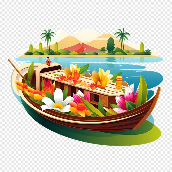 Immerse yourself in the vibrant beauty of Southeast Asia with our free PNG download featuring an exotic Thai longtail boat. This stunning illustration showcases a traditional wooden boat adorned with a breathtaking array of colorful tropical flowers, including vibrant lotus and plumeria-like blooms. A small figure in a traditional conical hat adds cultural authenticity as the boat glides on serene blue water, set against a backdrop of lush palm trees and distant mountains under a warm sky. Perfect for travel-themed designs, cultural presentations, website graphics, or adding a touch of exotic charm to any creative project. Download this high-quality, transparent PNG for free and bring the essence of a Thai floating market to your work today!