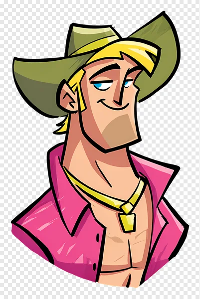 Download this vibrant PNG of a confident cartoon man, perfect for adding a touch of charm and personality to your projects. He sports stylish blond hair, piercing blue eyes, an olive green cowboy hat, and a striking pink collared shirt worn open to reveal a gold chain and a hint of a muscular chest. His smirking, friendly expression conveys charisma and a laid-back attitude. Ideal for avatars, social media graphics, web design, presentations, and more. This high-quality, transparent PNG is available for free download. Add this suave character to your designs today!