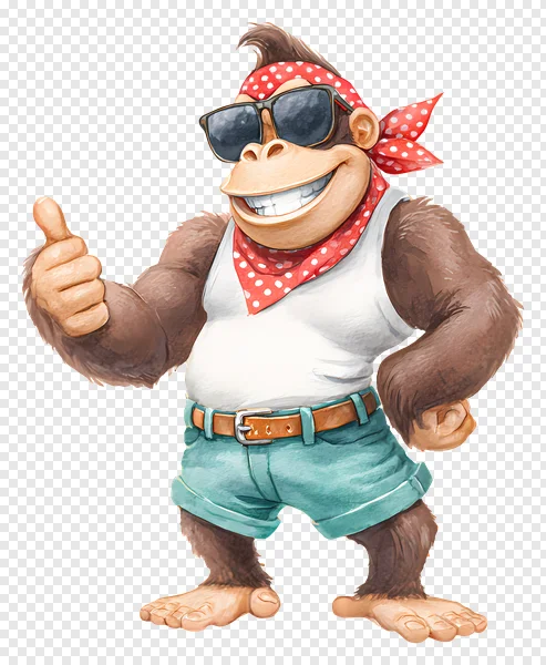 Download this vibrant and cheerful cartoon monkey PNG for free! This cool ape character, sporting stylish black sunglasses, a red polka dot bandana, a crisp white tank top, and trendy blue shorts, gives a positive thumbs up with a big, friendly smile. Perfect for adding a fun, summery, or confident vibe to your graphic design projects, presentations, social media, or personal creations. Its transparent background makes integration seamless into any design. Get this high-quality, expressive monkey graphic instantly and brighten up your digital content with a touch of playful charm and positivity!