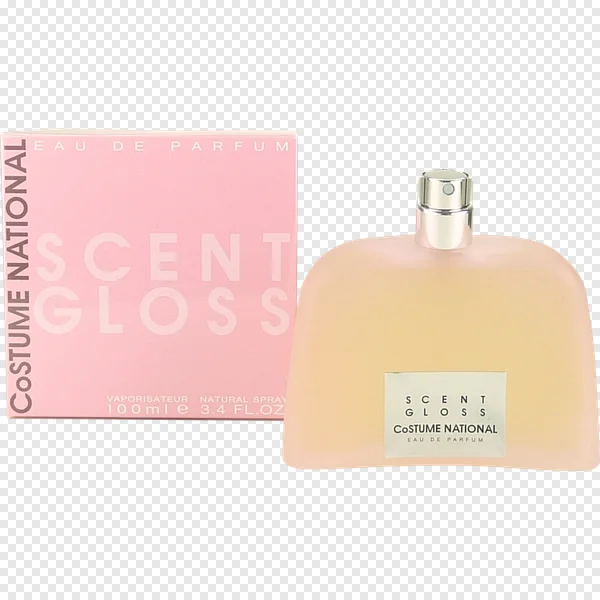 Download this high-quality, free PNG image of the exquisite Costume National Scent Gloss Eau de Parfum. This professional studio shot features the unique pale yellow, frosted perfume bottle with its sleek silver sprayer, displayed alongside its elegant pink packaging box. The packaging clearly shows "SCENT GLOSS", "COSTUME NATIONAL", "EAU DE PARFUM", and "100ml 3.4 FL.OZ". With its transparent background, this premium visual is perfect for e-commerce product listings, beauty blogs, marketing campaigns, graphic design projects, or any digital content needing a touch of luxury and sophisticated fragrance imagery.