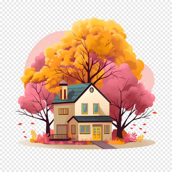 Download this enchanting Autumn House PNG for free, featuring a charming two-story home nestled amidst vibrant fall foliage. Experience the beauty of the season with golden-yellow and rich pink trees, artistic fallen leaves, and lush pink and orange bushes. This high-quality, whimsical illustration is perfect for seasonal greeting cards, digital art projects, social media posts, website banners, educational materials, and more. Capture the cozy essence of autumn with this stunning, colorful dwelling. Ideal for adding a touch of warmth and charm to any creative endeavor. Get your free fall house transparent PNG today!