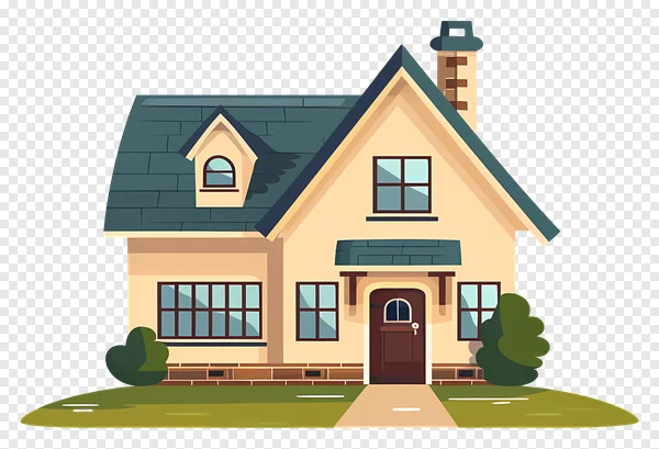 Download this charming, high-quality cartoon house PNG illustration for free! This delightful flat design features a cozy residential home with cream-colored walls, a stylish blue-grey shingled roof, a prominent chimney, and a welcoming dark brown front door with an arched window. Lush green grass and neat bushes adorn the front yard, complemented by a light pathway. Perfect for real estate projects, architectural concepts, children's books, website graphics, or adding a friendly touch to any design. Its transparent background makes integration seamless. Get your free vector-style home clip art today for instant use in your creative projects!