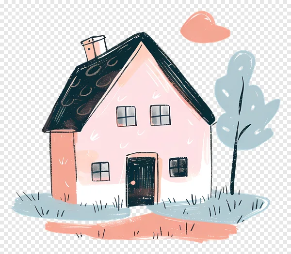 Download this adorable free PNG illustration of a charming pink house with a striking dark teal roof and door. This whimsical, hand-drawn artwork features a cozy two-story home, a stylized blue-grey tree, and a soft peach cloud, all rendered in a beautiful watercolor-like texture. Perfect for real estate blogs, kid's projects, home decor mockups, digital scrapbooking, presentations, or adding a touch of warmth to any design. Its transparent background makes it easy to integrate into your creative projects. Get this cute, modern house graphic instantly for your personal or commercial use!
