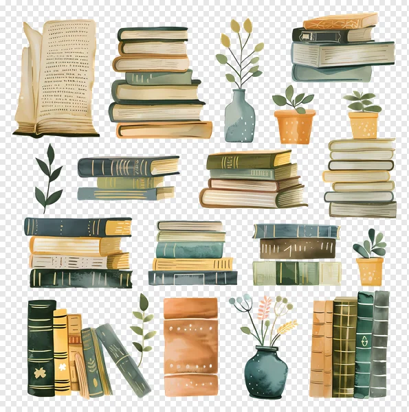 Tags: academic book lover book stack books cozy aesthetic digital art education free clipart greenery knowledge library literary open book potted plants reading stacked books study transparent PNG vintage books watercolor illustration