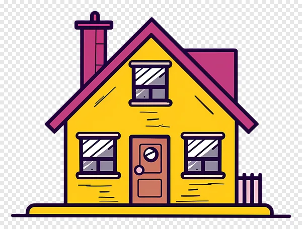 Discover this charming and cozy cartoon house PNG, featuring a vibrant yellow body, a stylish pink roof, and a contrasting magenta chimney, all outlined in dark purple. This delightful illustration captures the essence of a welcoming home with its detailed windows, front door, and a quaint small fence. Perfect for adding a touch of whimsy to your digital projects, website graphics, educational materials, or creative designs. Download this high-quality, free transparent background vector graphic for personal and commercial use and easily integrate it into any project. Get your free home illustration now!