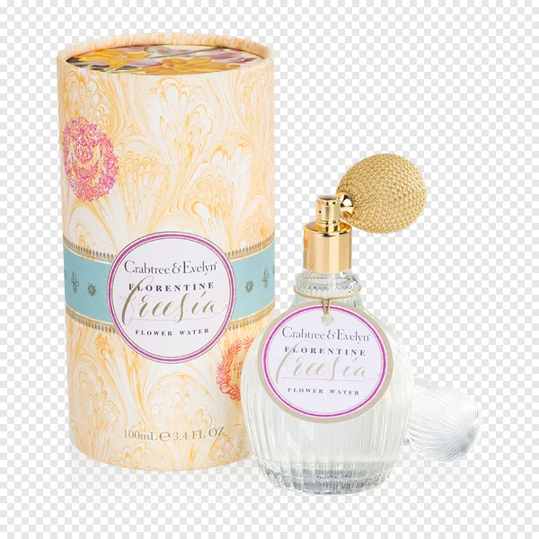 Download this stunning, high-quality PNG image of Crabtree & Evelyn's Florentine Freesia Flower Water. This elegant free PNG features a luxurious ribbed glass perfume bottle with a classic golden atomiser pump, alongside its beautifully designed cylindrical box with a vintage marbled pattern and delicate floral accents. Perfect for beauty blogs, e-commerce product listings, graphic design projects, or any content requiring a touch of sophistication and natural fragrance imagery. Get this transparent background Freesia scent bottle image for your creative needs today!