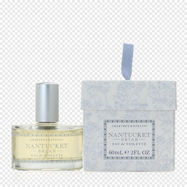 Download this high-quality, free PNG image of Crabtree & Evelyn Nantucket Briar Eau de Toilette. Featuring a classic glass perfume bottle with clear amber liquid, a sleek silver cap, and its beautifully patterned floral gift box in light blue and white, complete with a charming ribbon. Perfect for beauty blogs, product mockups, graphic design projects, or e-commerce visuals. Get this elegant fragrance product shot for your next creative endeavor, ideal for illustrating luxury, personal care, and sophisticated scents.