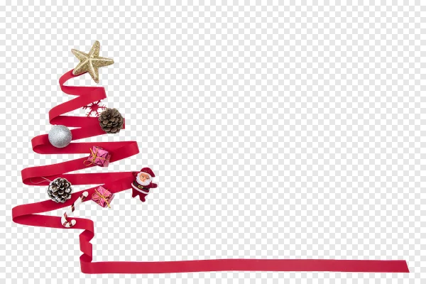 Deck your digital designs with this beautiful free PNG of a creative red ribbon Christmas tree. Adorned with a shimmering golden star, glittery silver bauble, festive pine cones, miniature pink gift boxes, a cute Santa Claus figure, and a classic candy cane, this transparent image is perfect for holiday cards, social media posts, website banners, or seasonal greetings. Its minimalist design with ample white space on the right allows for easy customization and text overlay. Download this high-quality festive decoration PNG instantly and add a touch of holiday cheer to your projects!