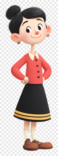 Download this charming and detailed 3D cartoon girl character PNG for free! This delightful illustration features a friendly female figure with a neat bun hairstyle, striking red jacket with a white collar, and a stylish black skirt adorned with golden stripes. Her confident pose, with hands on hips and a warm smile, makes her perfect for a variety of projects. Ideal for educational materials, presentations, kids' content, websites, apps, or any graphic design needing a cute, professional, and approachable character. Get this high-quality, transparent PNG image instantly for your creative endeavors.