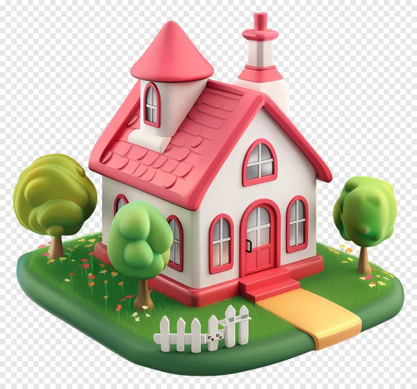 Download this adorable 3D cartoon house PNG, a charming illustration featuring a vibrant pink tiled roof, quaint white walls with arched windows, and a welcoming red front door. Set on a lush green lawn with cheerful small flowers, two stylized trees, and a classic white picket fence, this sweet home design exudes warmth. The golden pathway adds a delightful touch. Perfect for enhancing children's book illustrations, game assets, web and app design, educational materials, or adding a friendly touch to any digital project. This high-quality graphic comes with a transparent background, ensuring seamless integration. Get your free download and bring a whimsical, inviting feel to your creative work!
