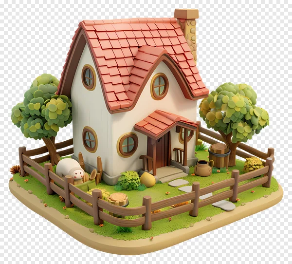 Download this charming, free 3D cartoon house PNG, perfect for adding a touch of whimsy to your projects. This adorable isometric village home features a vibrant red tiled roof, cozy white walls, and quaint round windows. The scene is completed with a lush green garden, a rustic wooden fence, two stylized trees, a friendly little sheep, and stepping stones leading to the front porch. Ideal for game assets, storybook illustrations, digital art, or any design needing a cute, rustic, or fantasy cottage aesthetic. Get this high-quality, transparent image now for your next creative endeavor!