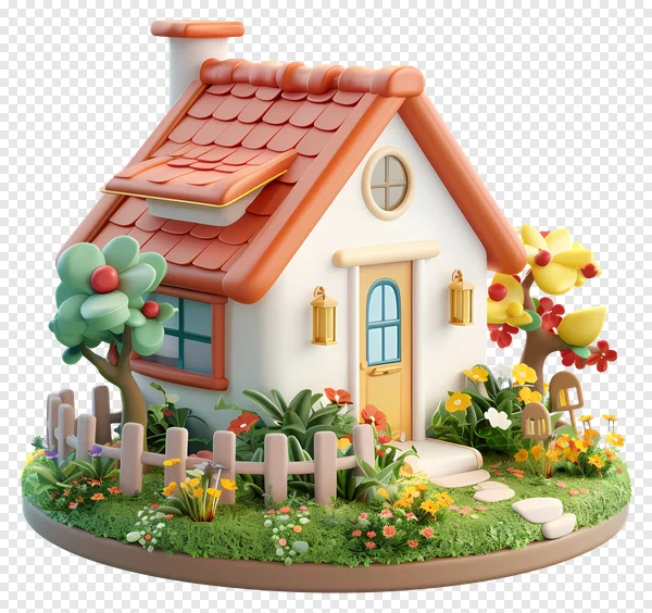 Step into a world of charm with this adorable 3D cartoon house PNG. Featuring a cozy white cottage with an orange tiled roof, inviting yellow arched door, a whimsical garden bursting with colorful flowers, a quaint picket fence, and two stylized trees, all on a transparent background. This high-quality, free-to-download image is perfect for adding a touch of magic to your graphic design projects, presentations, children's book illustrations, web design, or any digital art. Enhance your creative works with this idyllic, fully-rendered home today!