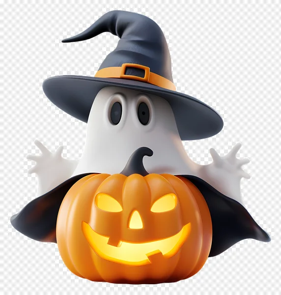 Download this adorable 3D rendered ghost wearing a classic pointed witch hat, playfully peeking over a brightly glowing jack-o'-lantern. Perfect for all your Halloween projects, decorations, invitations, social media posts, and educational materials. This free transparent PNG image features a friendly, cartoon-style spirit, making it ideal for both kids and adults. Get this high-quality graphic now to add a festive and slightly spooky touch to your designs and get into the trick-or-treat spirit!