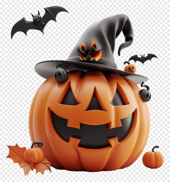 Get ready for spooky season with this adorable 3D Halloween Jack-o'-Lantern PNG! Featuring a cheerful, smiling pumpkin wearing a classic witch hat, surrounded by cute flying bats and mini decorative pumpkins. This vibrant, high-quality graphic is perfect for all your Halloween creative projects, invitations, social media posts, or digital decorations. Download this transparent, festive pumpkin illustration for free and add a touch of charming fright to your designs. Ideal for autumn themes and seasonal celebrations. Grab your free Halloween PNG today!