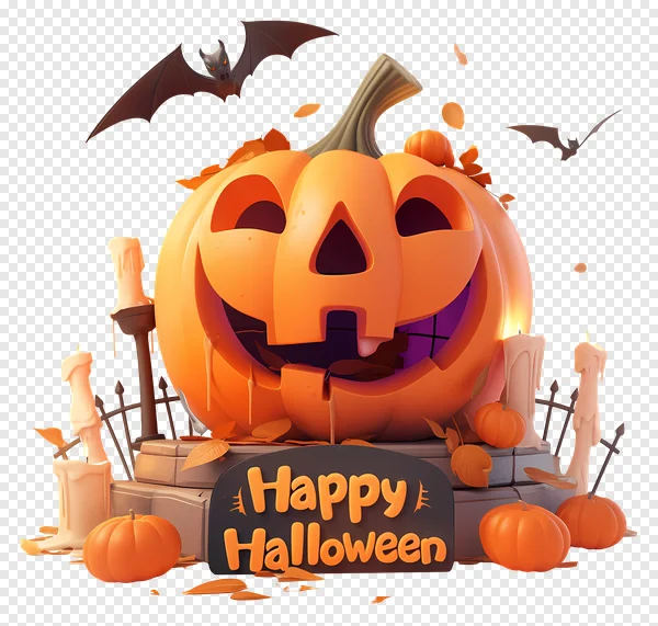 Get into the Halloween spirit with this adorable 3D rendered Jack-o'-lantern PNG! Featuring a large smiling pumpkin, a prominent 'Happy Halloween' sign, spooky flying bats with glowing eyes, melted candles, and scattered autumn leaves, all set on a mysterious base. This high-quality graphic is perfect for all your festive needs. Download this free, vibrant image to enhance your party invitations, social media posts, website banners, craft projects, or seasonal decorations. Ideal for adding a touch of cute spooky fun to any digital design and celebrating the autumn holiday season!