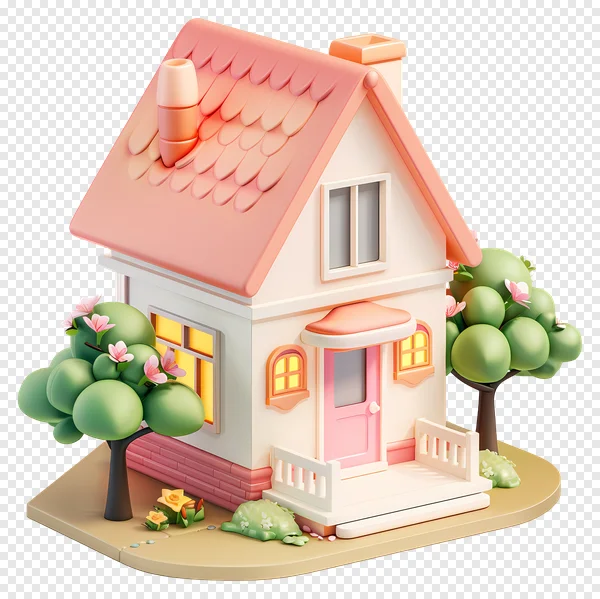 Download this adorable 3D pink cartoon house PNG for free! This high-quality, transparent image features a charming stylized home with a warm glowing interior, a unique scalloped roof, and a welcoming pink door. Flanked by lush green trees with delicate pink blossoms and sweet yellow flowers on a tranquil beige ground, it creates an idyllic scene. Perfect for adding a touch of whimsy to your graphic design projects, presentations, children's book illustrations, game assets, website banners, or any digital art. Get this vibrant, and cozy dream house illustration with an isolated background for instant use. Enhance your creative works with this unique architectural gem.
