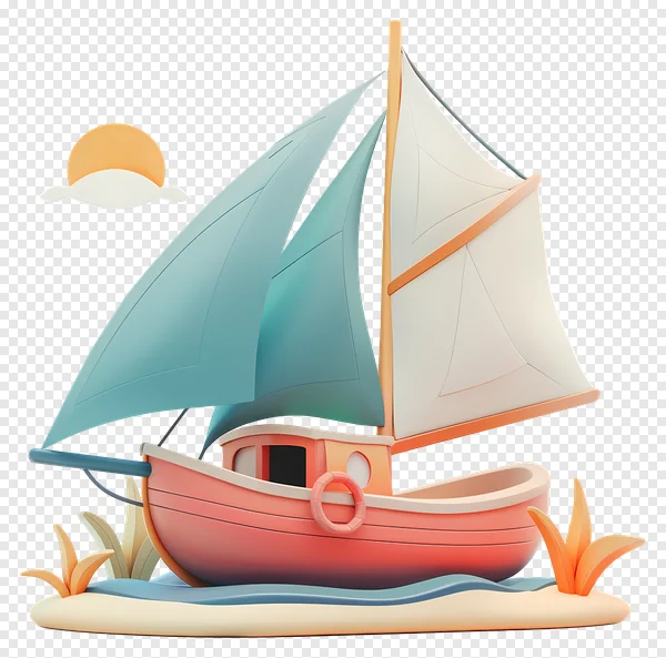 Set sail with our adorable 3D sailboat PNG, featuring a charming red hull, vibrant blue and white sails, and a playful cartoon style. This delightful yacht sits on serene blue waters near a sandy beach with lush plants, under a cheerful sun and cloud. Perfect for summer promotions, travel blogs, children's designs, vacation themes, or any creative project needing a touch of nautical whimsy. Enhance your graphics with this high-quality, free-to-download PNG image, ideal for web design, presentations, and digital art. Get your free sailboat clipart today and bring a sunny, adventurous vibe to your next design!