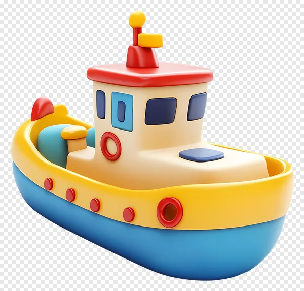 Dive into fun with this vibrant 3D toy boat PNG! Featuring a charming cartoon style, this tugboat boasts a cheerful blue hull, bright yellow deck, and playful red accents. Perfect for children's projects, educational materials, game design, website graphics, or any creative endeavor needing a touch of nautical whimsy. Its smooth, glossy finish and simple design make it ideal for various digital and print applications. Download this high-quality, free transparent PNG image today to bring a splash of color and joy to your designs. Easy to use, no attribution required. Get your free cute toy boat icon now!