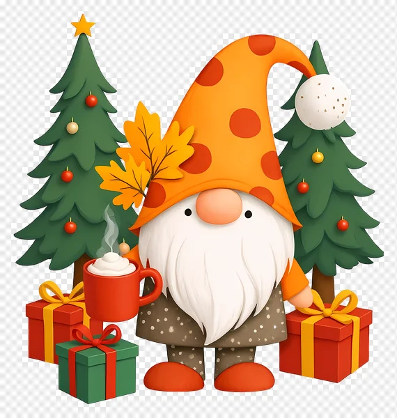 Download this charming free PNG of a delightful holiday gnome, perfect for blending autumn warmth with festive Christmas cheer! This adorable illustration features a gnome with a distinctive orange polka-dot hat adorned with vibrant fall leaves, holding a steaming red mug topped with whipped cream. The gnome is surrounded by beautifully decorated Christmas trees with red and gold ornaments, and sparkling gift boxes wrapped in bows. This high-quality, transparent image is ideal for adding a touch of cozy magic to your holiday greeting cards, digital art, social media posts, scrapbooking projects, and more. Get your free, high-resolution graphic today and enchant your audience!