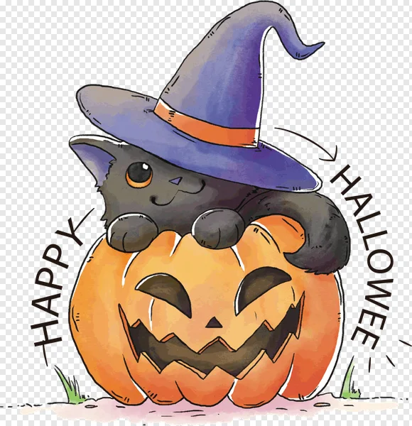 Dive into the Halloween fun with this charming free PNG! It features an adorable black cat wearing a purple witch hat with an orange band, playfully peeking out from a carved, smiling jack-o'-lantern pumpkin. The vibrant watercolor-style illustration and "Happy Halloween" text make it perfect for adding a cute, spooky touch to your designs. Ideal for party invitations, digital crafts, website banners, social media posts, kids' projects, or festive decorations. Download this high-quality, transparent background graphic now and make your Halloween creations extra special!