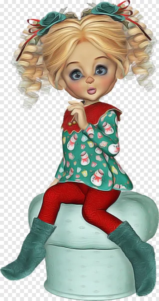 Download this adorable free PNG of a cute blonde girl, reminiscent of a charming Christmas elf or a sweet doll, perfect for your holiday projects! This whimsical digital illustration features a character with bright blue eyes, rosy cheeks, and delightful curly blonde pigtails adorned with teal flowers and red ribbons. She's dressed in a festive teal tunic patterned with cheerful snowmen and colorful candies, vibrant red leggings, and matching teal boots, all while sitting on a soft blue cushion. Ideal for scrapbooking, digital art, greeting cards, seasonal decorations, educational materials, or any personal creative venture. Get this transparent background image today and add a touch of playful holiday magic to your designs for free!