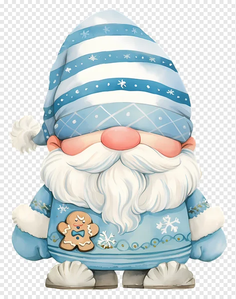 Download this adorable watercolor-style blue Christmas gnome PNG for your festive projects! This charming winter gnome features a cozy striped hat with snowflakes, a fluffy white beard, a cheerful pink nose, and a cute gingerbread man accent on its blue sweater. Perfect for holiday cards, digital scrapbooking, social media graphics, blog posts, and DIY crafts. Get this high-quality, transparent background illustration for free and add a touch of magic to your designs. Ideal for Christmas, New Year's, and winter themes, bringing a jolly spirit to any creation.