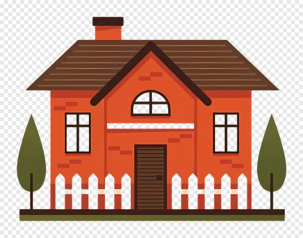 Download this charming cartoon house PNG for free! This adorable illustration features a classic orange-red brick house with a brown shingled roof, a chimney, and a welcoming wooden door. Flanked by simple green trees and a quaint white picket fence, it exudes a cozy, inviting feel. Perfect for adding a touch of whimsy to your digital projects, presentations, educational materials, or craft designs. The transparent background makes it easy to integrate into any creative work. Get your high-quality, free home illustration now!