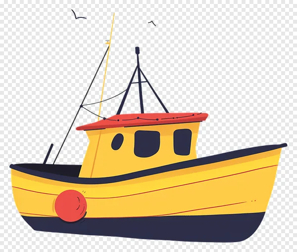 Download this adorable cartoon fishing boat PNG image for free! Perfect for kids' projects, nautical themes, illustrations, and more. This high-quality, transparent background graphic features a charming yellow boat with a red buoy and seagulls. Enhance your designs with this delightful, royalty-free image – no attribution required! Use it for websites, presentations, or personal crafts. Get your free download now!