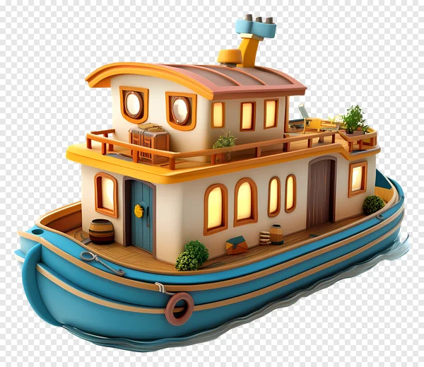 Set sail on creativity with this charming 3D cartoon houseboat PNG, perfect for adding a touch of nautical fun to any project. This high-quality image features a vibrant blue hull, cozy cream cabin with orange trim, a wooden deck adorned with potted plants, and a friendly blue door. Details like a lifebuoy, wooden crates, and a distinctive smokestack complete its adorable, stylized look. With a transparent background, this versatile PNG is ideal for children's books, educational materials, website graphics, craft projects, or digital art. Download this free, isolated boat illustration to bring a playful and whimsical maritime vibe to your designs today!