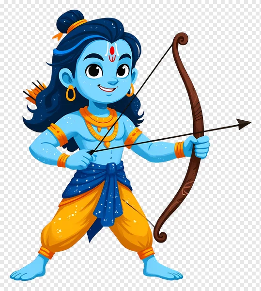 Download this enchanting cartoon Lord Rama PNG for free! This adorable illustration features the beloved Hindu deity with his iconic blue skin, a radiant smile, long flowing hair, and a prominent red tilak. Depicted in a divine archery pose, holding his bow and arrow, he is adorned with intricate golden jewelry including a necklace, earrings, and bangles. Perfect for celebrating Ram Navami, Diwali, Dussehra, or adding a touch of spirituality and cultural charm to your designs. Use this high-quality, transparent background image for kids' projects, cultural content, festive greetings, educational materials, digital art, and more. Enhance your digital creations with this charming and powerful representation of the Ayodhya prince!
