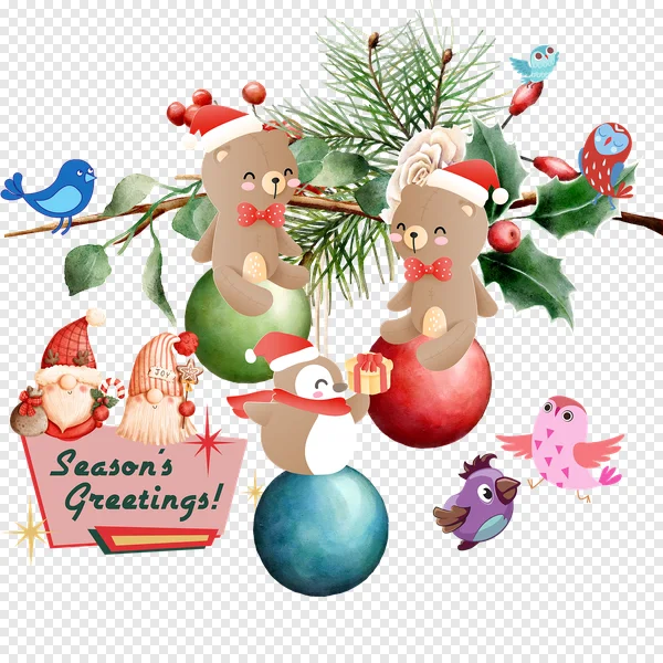 Tags: Christmas Christmas gnomes Santa hat Season's Greetings birds cartoon cheerful cute characters festive gifts holiday holly joyful ornaments penguin pine teddy bears transparent PNG watercolor winter