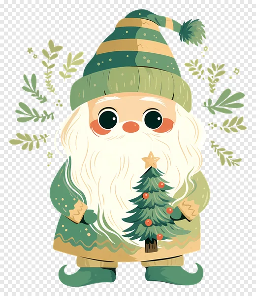 Tags: Christmas decor Christmas gnome Christmas tree Santa Claus adorable cartoon Santa cute gnome digital art festive illustration free PNG green leaves holiday character holiday spirit red berries seasonal star ornament striped hat whimsical art white beard winter design