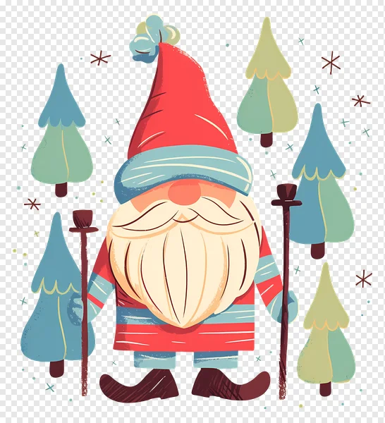 Discover this charming free PNG of a festive Christmas gnome, perfect for your holiday projects! Featuring a whimsical red-hatted gnome with a long white beard, dressed in striped winter attire and holding staffs, surrounded by colorful stylized Christmas trees and playful snowflakes on a dark background. This delightful cartoon illustration brings a cozy, magical touch to greeting cards, digital designs, scrapbooking, or seasonal decorations. Download this high-quality, transparent PNG image today to add a touch of Nordic holiday spirit to your creations. Ideal for personal and commercial use!