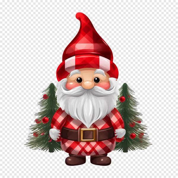 Download this adorable free Christmas Gnome PNG featuring a charming character in a festive red and white plaid suit and matching hat, complete with a fluffy white beard and rosy cheeks. Two decorated pine trees stand behind him, adorned with red baubles, adding to the holiday cheer. Perfect for enhancing your Christmas cards, digital designs, party invitations, crafts, or seasonal projects. This high-quality transparent PNG is ready to bring whimsical joy to your creations. Get your free download today and spread some festive spirit!