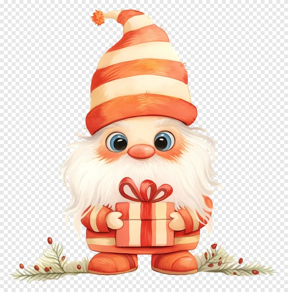Discover this adorable Christmas gnome PNG, featuring a charming character in a festive red and white striped hat, a fluffy white beard, and bright blue eyes. This cute holiday elf holds a beautifully wrapped gift box with a red ribbon, ready to spread cheer. Perfect for Christmas cards, digital scrapbooking, party invitations, social media graphics, and seasonal decorations. Download this high-quality, transparent background image for free and add a touch of festive magic to your creative projects!