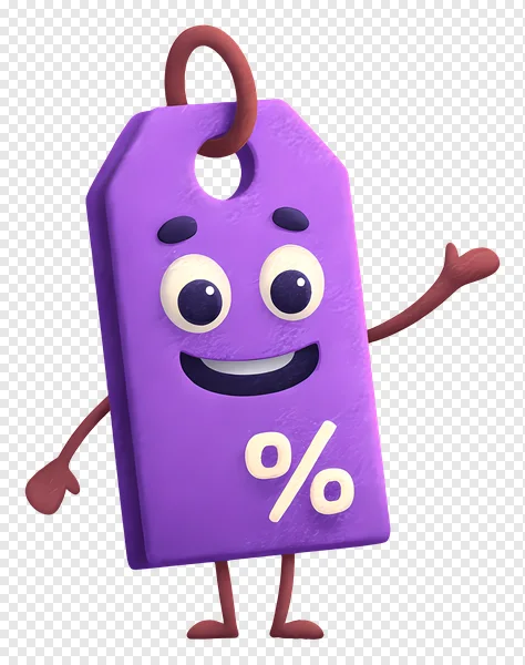Download this adorable, high-quality purple discount tag character PNG for free! Perfect for sales promotions, marketing materials, website graphics, and more. This friendly, cartoon-style tag with a percentage symbol and expressive face will add a playful touch to your projects. Transparent background for easy integration. Get your free PNG now and boost your visual content!