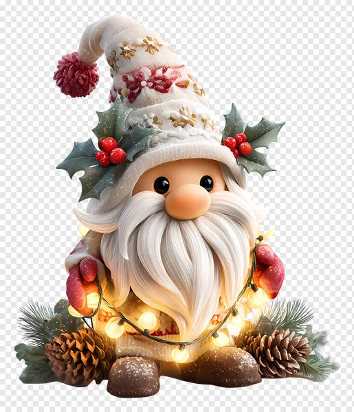 Add a touch of warmth and cheer to your holiday projects with this delightful Christmas Gnome PNG. Featuring a charming gnome with a long white beard, cozy hat adorned with snowflakes and holly, and wrapped in glowing string lights. This high-quality, free-to-download image also includes realistic pinecones and evergreen branches, all on a transparent background for easy integration into cards, digital art, social media posts, and festive crafts. Get your cute holiday gnome illustration now!
