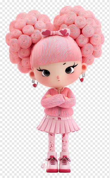 Download this adorable free PNG of a charming 3D cartoon girl! Featuring a unique 'candy hair' style made of pink and white spiral lollipops, a sweet heart-shaped bow, and a playfully grumpy expression with crossed arms. Her all-pink outfit includes a striped top, pleated skirt, patterned tights, and matching sneakers. Perfect for adding a touch of kawaii cuteness to your digital designs, scrapbooking, greeting cards, stickers, or social media posts. This high-quality image with a transparent background is ready to enhance your creative projects. Get this sweet and sassy character today!