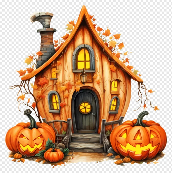 Immerse yourself in the spirit of Halloween with this enchanting Pumpkin House PNG. This unique illustration features a charming, gourd-shaped cottage with warm, glowing windows and a whimsical wooden door, beautifully adorned with vibrant autumn leaves. Two cheerful, luminous Jack-o'-lanterns flank the entrance, adding a perfect blend of spooky and cute. Ideal for Halloween party invitations, festive decorations, educational materials, digital art, or any fall-themed project. Download this high-quality, free PNG with a transparent background to easily integrate into your designs and bring a touch of magical autumn charm.